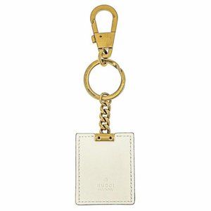 The Gucci Embroidered Worldwide Keychain in White is crafted in Italy from aged gold-tone metal and smooth calfskin leather. This key chain includes a rectangular leather charm embroidered with the Gucci Worldwide logo, and hangs from an aged gold chain with a key ring.