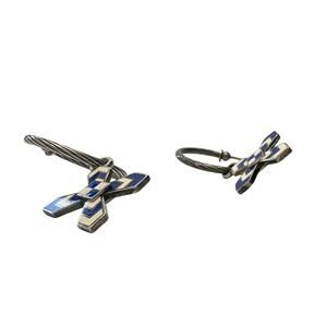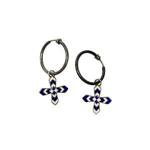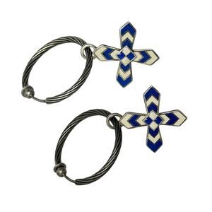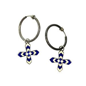Beautiful Gucci hoop earrings with white and blue enamel painted cross dangles. Hoops have twisting lines going around them to add texture. Enamel is vivid and bright on both sides of the cross.