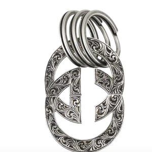 Featuring the instantly recognizable Interlocking G with an alluring engraving, this sterling silver Gucci keychain speaks to the influence behind the Epilogue collection in which fashion is timeless. It has intertwined key rings decorated with a dangling iconic G motif charm.