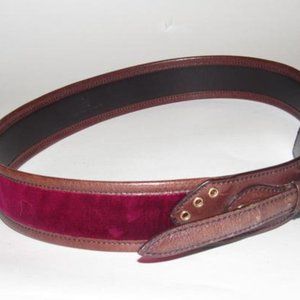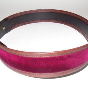 Gucci Brown Leather and Burgundy Velvet with A Studded Brass Equestrian Motif Buckle Vintage Belt/Designer Belt. Gucci, vintage, brown leather and burgundy velvet, brass studded buckle with an equestrian design! The belt is signed on the back as being 'Gucci, Made in Italy' with the serial #'144196 214351 80 27'. The belt is 2" wide in brown leather with burgundy border. 31"L x 2"W x 0"H. Please see photos for more details. All measurements are approximate. Item #: 244294901.