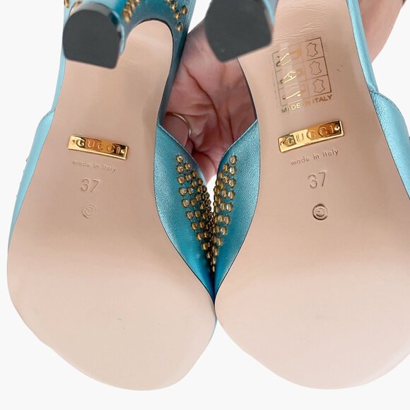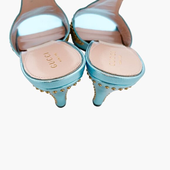 Gucci Fedra Crystal Embellished Mules EU 37 US 7 Metallic Blue High Heel Sandals