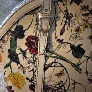Gently used Gucci Flora collection satchel bag. Gold tone hardware. Leather trim. Includes crossbody strap and original dust bag.