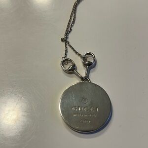 Gucci horsebit necklace with flowers and butterfly. I do not have packaging or any certificate of authenticity as I purchased it about 8 years ago at a second hand shop in Italy. It is stamped with .925 and does polish up nicely. Measures an inch wide