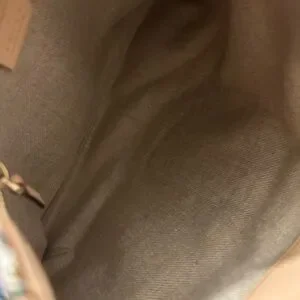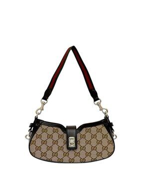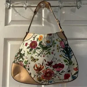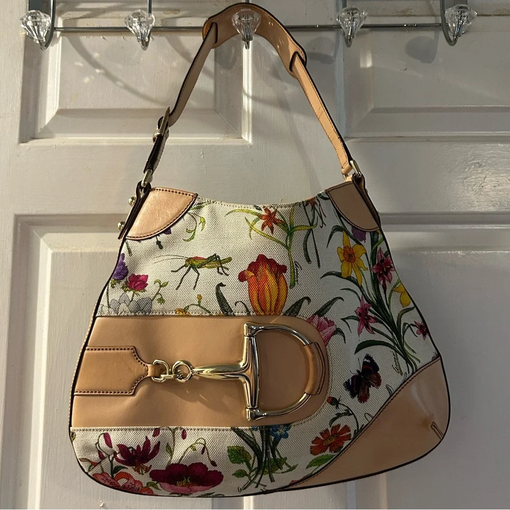 Gucci shoulder bag in floral canvas with tan leather trim. Features a prominent gold-tone bit buckle accent. Single top handle for shoulder carry. Vibrant multicolor floral print lends a feminine touch.GUC
