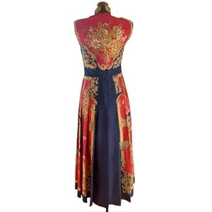 twill, folds, multicolor pattern, round collar, sleeveless, no pockets, rear closure, zip, fully lined