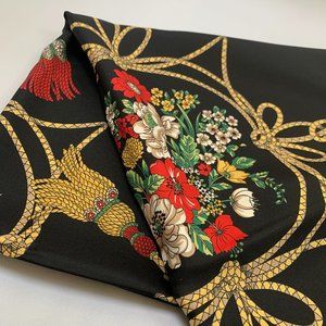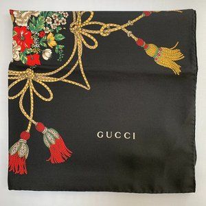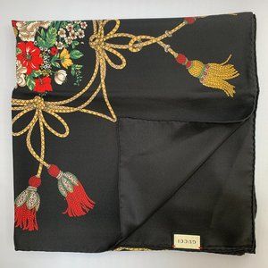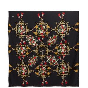 Crafted from 100% silk in Italy. This oversized scarf doubles as a shaw and features a floral rope tassel print with geometric shapes, a deep, solid black base, GG logo at its center, and Gucci logo on the side.