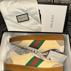 Elegant Gucci sneakers in cream with signature green and red accents. Ideal for everyday style.