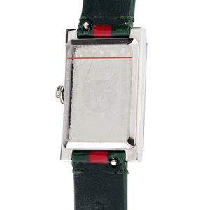 Stainless steel 21mm x 34mm Gucci G-Frame watch featuring a quartz movement with a smooth bezel, red and green mother of pearl dial and a red and green leather strap with a tang buckle. Includes manufacturer's box, undated official sales warranty and additional watch collateral. Unfortunately, due to restrictions, this item may not be eligible for shipping in all areas.