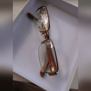 Stylish Gucci rimless glasses. Elegant brown arms with logo detail. Perfect for a sophisticated look.