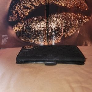 For sale is a Gucci, black canvas with the Interlocked gg in the side wallet with, checkbook holder, and card slots! This practical and great looking, classic wallet from Gucci is a perfect mate to any purse or style!
