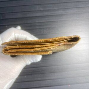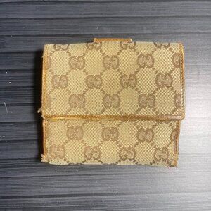 Gucci bifold wallet crafted in GG canvas with leather trim. Compact and functional design with card slots and bill compartments.
