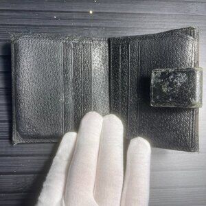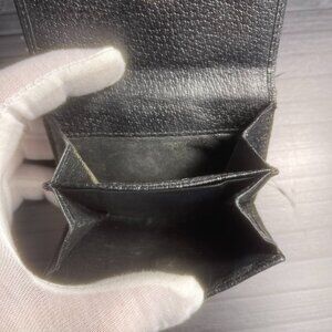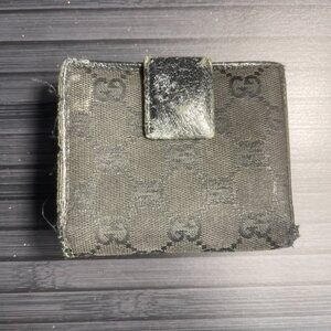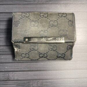 Classic Gucci bifold wallet crafted in black GG canvas with leather trim. Compact and functional with card slots and bill compartments.