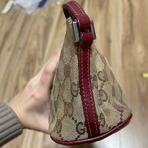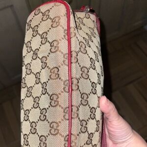Gucci Beige/Brown GG Canvas Boat Baguette in excellent used condition. It comes in beige and red hues. No tears, holes but some slight stains. Both exterior and interior are beautiful and clean. Some minor scratches on the corners. comes from a non smoking, pet free home.