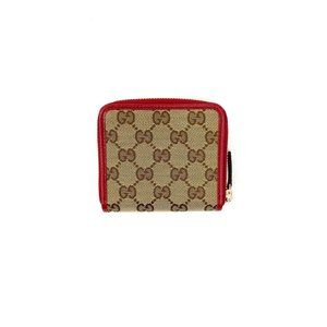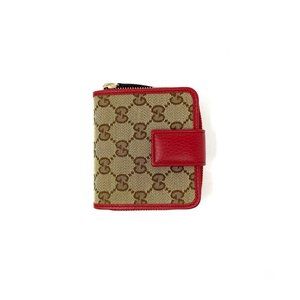 Brand new red and tan GG canvas Gucci Compact French Wallet with gold-tone hardware, black woven lining, red leather trim throughout, single coin compartment featuring zip-around closure, three interior compartments; single bill compartment, two slit pockets, six card slots and snap closure at front. Includes box and dust bag.