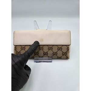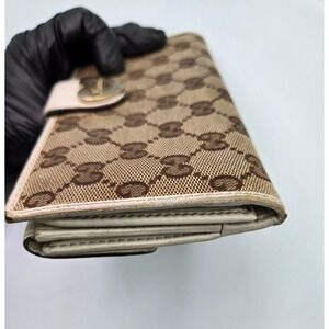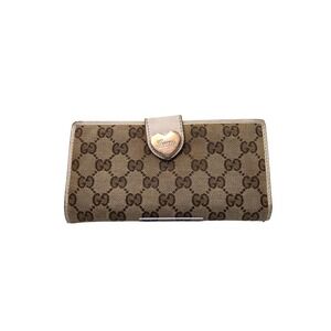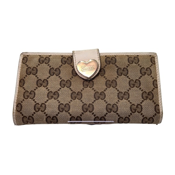 Keywords: Gucci wallet, GG canvas wallet, Bifold wallet, Designer wallet, Women's wallet, Heart clasp wallet, Beige wallet, Brown wallet, Monogram wallet, Luxury accessory, Gucci accessory, Classic wallet, Card holder, Billfold, Authentic Gucci