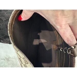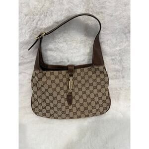 Classic and timeless, this authentic Gucci GG Canvas Jackie Shoulder Bag features the house’s signature beige/brown monogram canvas with rich brown leather trim. The bag is accented by the iconic gold-tone piston clasp and an adjustable shoulder strap for a refined, versatile silhouette. A must-have for Gucci collectors, this piece embodies vintage elegance with everyday practicality.