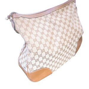 This Gucci hobo bag boasts a sophisticated blend of GG canvas and leather, ideal for those who appreciate luxury fashion accessories. Its neutral beige and brown tones make it versatile for various settings. The bag's iconic pattern and quality craftsmanship ensure that it stands out in any wardrobe.