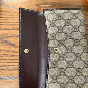 Authentic Gucci Continental bifold wallet in beige GG monogram canvas and leather trim. Snap button closure, 2 bill compartments, 7 card slots, 2 open pockets, coin pocket. Vintage Y2K