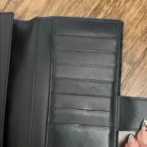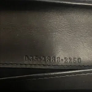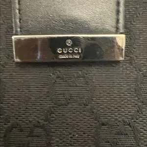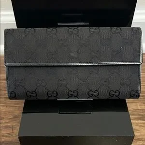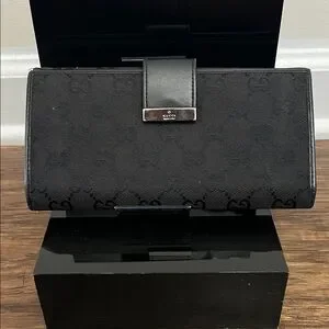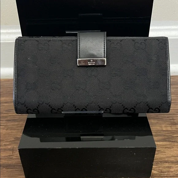 Sleek Gucci wallet in black monogram canvas. Leather strap secures the flap. Polished metal logo plate accent. Streamlined silhouette for daily use.