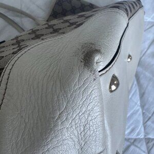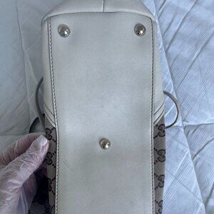 The handbag in the image is a Gucci GG Canvas Tote Bag, specifically from the Gucci GG Plus collection. This bag style is typical of Gucci’s mid-2000s to early 2010s collections