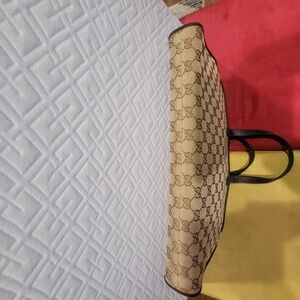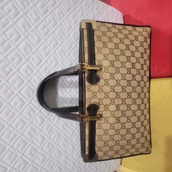 Beautiful Vintage, hard to find, great add to your collection, Good condition, some discoloration on hardware.. Authentic.. This Gucci satchel showcases a luxurious blend of brown and gold tones, highlighted by the iconic GG monogram canvas. The structured design and dark brown leather accents offer a timeless elegance, making it a standout piece in any collection.