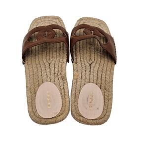 Gucci GG Espadrille Flat Slide Sandal Brown Leather Square Toe Size 37.5 US 7.5