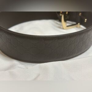 Authentic Gucci Guccissima Belt in dark brown embossed leather featuring the iconic interlocking GG monogram throughout. Finished with a sleek gold-tone buckle engraved with “Gucci,” this belt is both luxurious and understated. A classic piece made in Italy, perfect for everyday wear or elevating high-waisted looks.