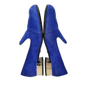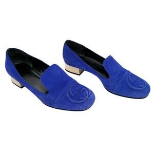 Gucci GG Logo Blue Suede Loafer Size 37 US 7 Chrome Block Heel Slip On Flat
