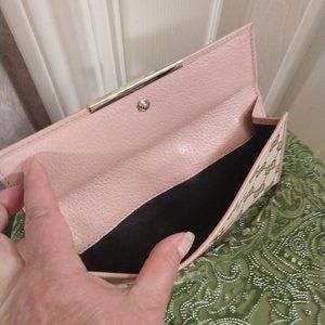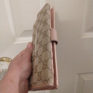 Authentic Gucci Leather Check & 7 Credit Slot Wallet. Condition is great with some light wear to the canvas, leather and hardware. All snaps are intact and work properly. Please examine all photos for the details. Serial #: 112715-2067 Dimensions: @ L 7.25" x H 3.75"