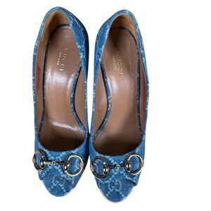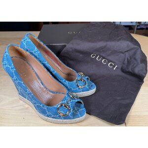 Gucci GG Logo Denim Espadrille Horsebit Wedge Heels Size 37.5