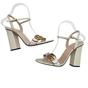Gucci GG Logo Marmont Block High Heel Sandal White Leather Gold Size 38.5 US 8.5