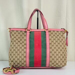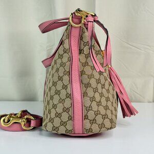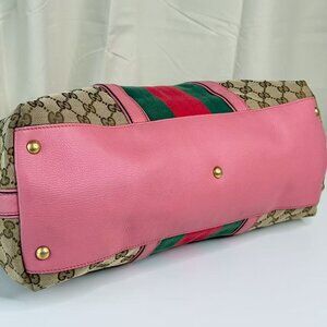 Gucci GG Logo Supreme Shoulder Bag Crossbody with Pink Trim and Green Red Stripe