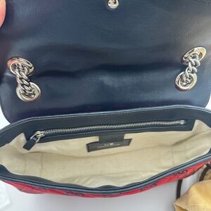 This limited edition Gucci Marmont Shoulder Bag is a true standout — crafted in bold red GG canvas with navy trim and finished with the house’s iconic Double G logo in aged silver hardware. The sliding chain strap allows versatile wear as a crossbody or doubled for the shoulder, while the flap closure opens to a microfiber-lined interior with pocket.