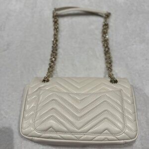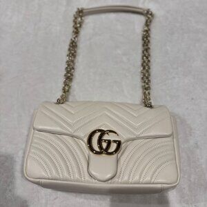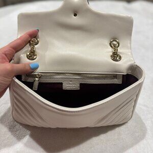 Beautiful and timeless Gucci GG Marmont shoulder bag in soft white matelassé chevron leather. Features the iconic oversized GG logo in antique gold hardware, sliding chain strap that can be worn crossbody or doubled on the shoulder, and flap closure with spring lock. The perfect everyday luxury bag that transitions seamlessly from day to night.