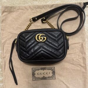 Authentic Gucci GG Marmont Mini black leather shoulder bag in great condition. Zip top closure with gold double g hardware and chain detail. Matelasse leather with a chevron design and GG on the back. Perfect everyday bag. Includes dust bag