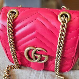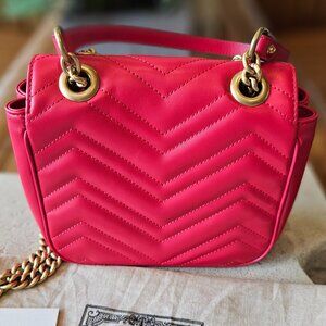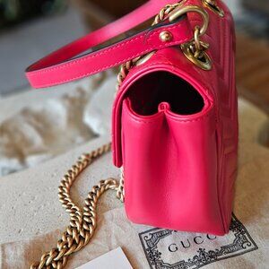 The GG Marmont has become synonymous with the House, thanks to its recognisable matelassé fabric and Double G hardware. Continuously reinvented through the seasons, new shapes are introduced within this signature line, matching Gucci's contemporary vision. Here, it's presented in red leather and further enriched with antique gold-toned details.