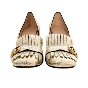 Gucci GG Marmont Pumps Gold Kiltie Leather High Block Heel Logo Fringe EU 40