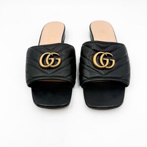 Gucci GG Marmont Quilted Chevron Black Leather Sandals Mules Flats