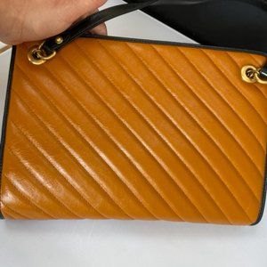 This shoulder bag is crafted of supple calfskin leather in burnt orange. This bag features an aged gold chain shoulder strap with a leather shoulder pad and an interlocking GG logo on the front. The top opens with a magnetic snap to a partitioned beige microfiber interior with zipper and patch pockets. This chic shoulder bag is perfect for any time of the day, whether it be for casual or formal wear, from Gucci!