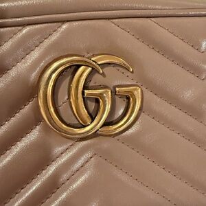 Chic and versatile Gucci GG Marmont camera bag in soft quilted leather — a classic crossbody with the signature GG logo and timeless shape that goes with everything.