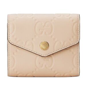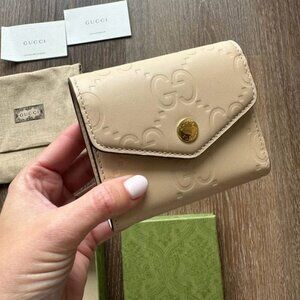 Beautiful and new Gucci GG Medium Wallet in Light Beige Leather. Never used and still in the original box from the Gucci store in Aspen with tags. Here, the emblematic GG motif plays on texture and a shiny finish to define this medium wallet in a delicate light beige.