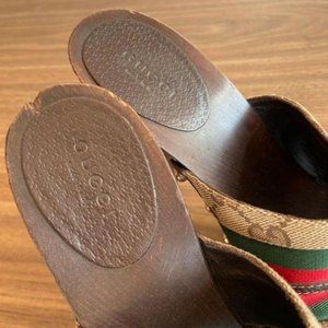 Gucci GG Monogram Canvas Horsebit Wood Platform Mules EU 36