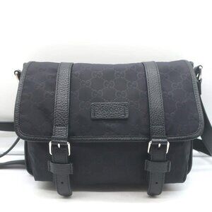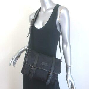 Gucci GG Monogram Double Buckle Flap Messenger Bag Black Nylon