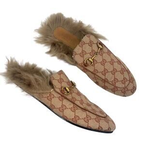 Gucci GG Monogram Fur Princetown Mules Horsebit Natural Size 39.5