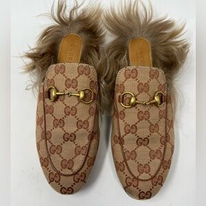 Gucci GG Monogram Horsebit Princetown Mule Slipper Brown Canvas Fur size 36.5 EU