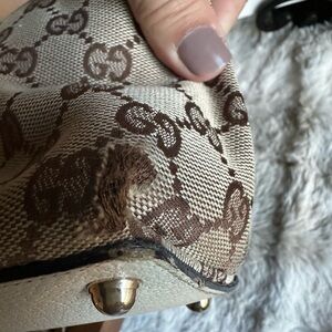 Elevate your style with this Gucci beige monogram tote bag. Authentic Gucci GG monogram eclipse shoulder bag. Gold tone hardware. Some scratches on hardware, some wear on straps, lining and exterior corners but overall great condition. Measures 9.5x13. See all photos and ask questions. COA included