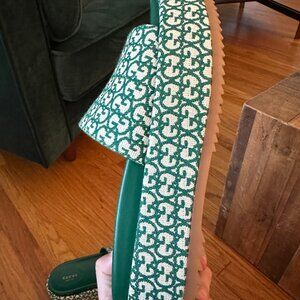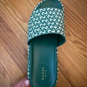 Beautiful Gucci platform slides, purchased July 2024. Size 39.5 (shown in photos). I am normally size 8.5 and they fit perfect. Leather inside, canvas outside, rubber soles. Only signs of wear are some dirt shown on the rubber soles. All canvas and leather areas look brand new. Very comfortable.