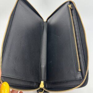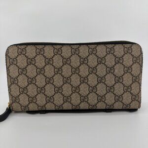 Authentic Gucci GG Monogram Wallet. This stylish travel wallet is crafted of brown Gucci GG Monogram coated canvas. Features black leather trip with a top handle and bordered trim. This compact clutch sized wallet features double 3/4 wrap around zipper that opens to a black leather interior.