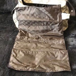 Gucci 2019 Collection. Beige and chocolate GG Plus coated canvas Gucci diaper bag with gold-tone hardware, single flat adjustable shoulder strap with shoulder guard, three exterior pockets; two with flap closures, chocolate nylon lining, three elasticized slit pockets at interior walls and velcro closure at front flap. Includes changing pad