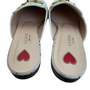 These luxury designer women's mules are Gucci Princetown leather loafers, crafted with premium monogram GG canvas and accented by the brand’s signature gold horsebit hardware. Featuring a sleek slip-on backless design, these Gucci mules blend timeless elegance with modern sophistication. The soft leather insole, adorned with a charming red heart detail, adds a touch of playful luxury and comfort. Perfect for elevating any outfit, these white and silver Gucci loafers are a must-have for fashion-forward women seeking high-end Italian craftsmanship and iconic style. Ideal for designer fashion enthusiasts, luxury footwear lovers, and Gucci collectors.